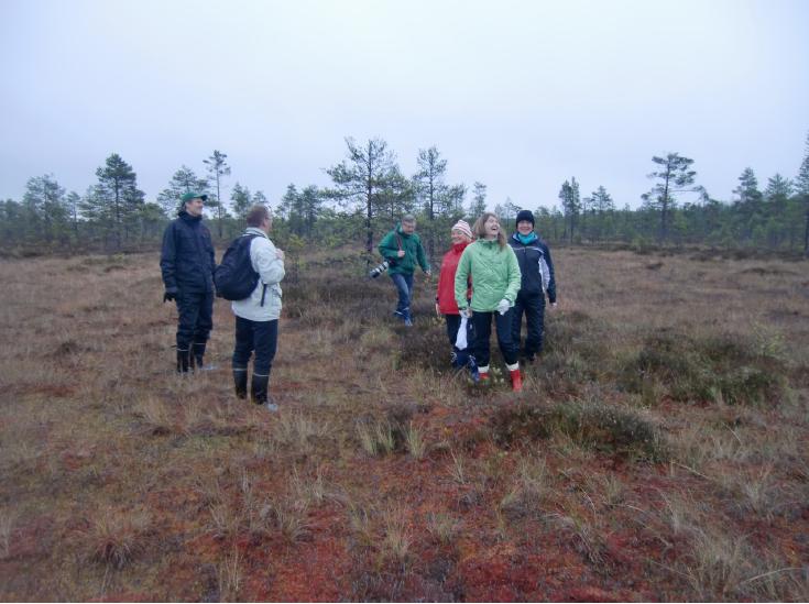 Tässä alla otos retkestä. Kuvassa vasemmalta Suomen Luonnonsuojeluliiton puheenjohtaja Risto Sulkava sekä suojeluasiantuntija Keijo Savola, Pertti Salolainen (kok), Tuija Brax (vihr), Johanna (vihr) ja Pirkko Ruohonen-Lerner (ps) syksyn raikkaalla suolla.